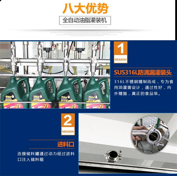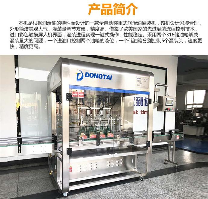 產(chǎn)品簡介: 本機是根據(jù)潤滑油的特性而設計的一款全自動稱重式潤滑油灌裝機,該機設計緊湊合理,外形簡潔美觀大氣,灌裝量調(diào)節(jié)方便,精度高,借鑒了歐美國家的先進灌裝流程控制技術,進口彩