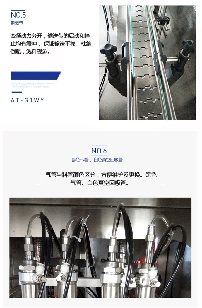 六頭柱塞式全自動(dòng)潤滑油灌裝機(jī) 設(shè)備簡介: 該六頭柱塞式全自動(dòng)潤滑油灌裝機(jī)獨(dú)特的灌裝頭設(shè)計(jì)及真空回吸系統(tǒng),確保灌裝過程無殘油滴漏,快慢雙速灌裝,灌裝速度可調(diào),杜絕溢瓶現(xiàn)象